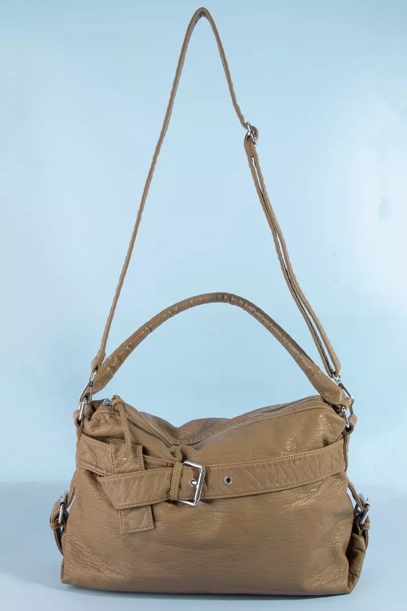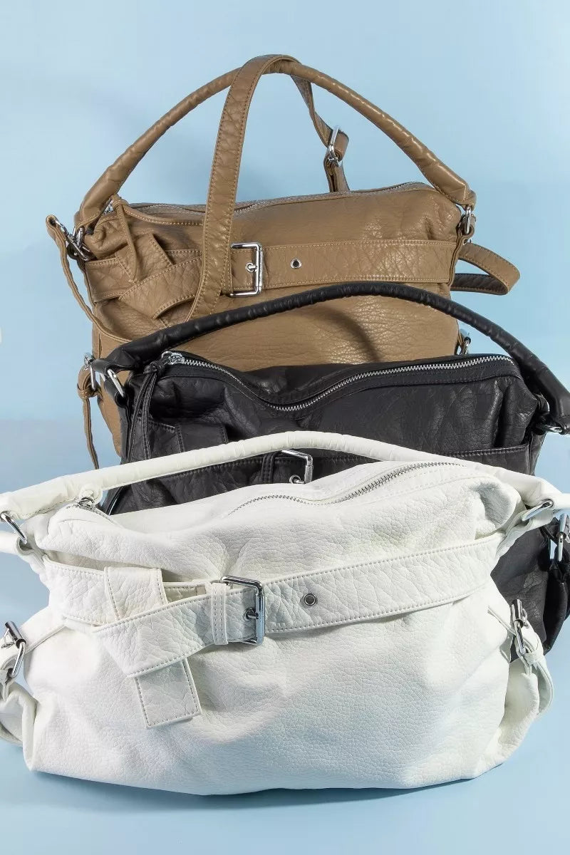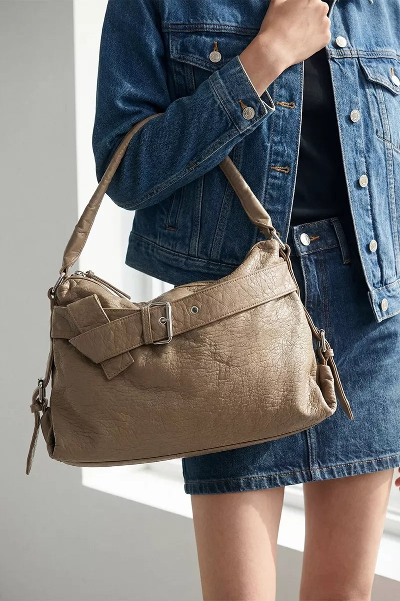 The buckle strap detail leather handbag is a chic and elegant accessory that exudes sophistication. Crafted from high-quality leather, this handbag offers durability and a luxurious feel. The buckle strap detail adds a touch of modernity and interest to the design. With ample space and compartments, this handbag provides practicality for storing your essentials in an organized manner. Whether for work or everyday use, this leather handbag is a timeless and versatile piece that complements any outfit with effortless style.