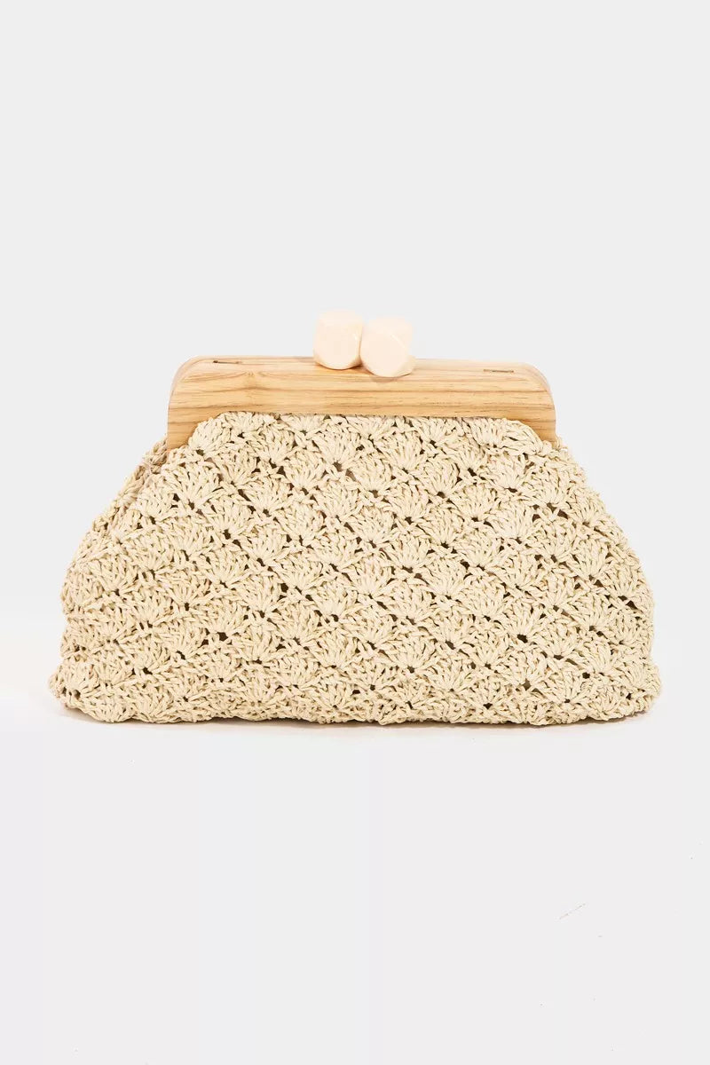 This stylish straw braided clutch bag features a unique wooden frame that adds a touch of natural charm to any outfit. The intricate braided design gives it a bohemian flair, perfect for summer or beach occasions. The wooden frame provides structure and durability to the bag, ensuring its longevity. With a secure clasp closure, this clutch is both stylish and functional, ideal for carrying your essentials in style. Elevate your accessory game with this chic and versatile clutch bag that complements a wide range of outfits.