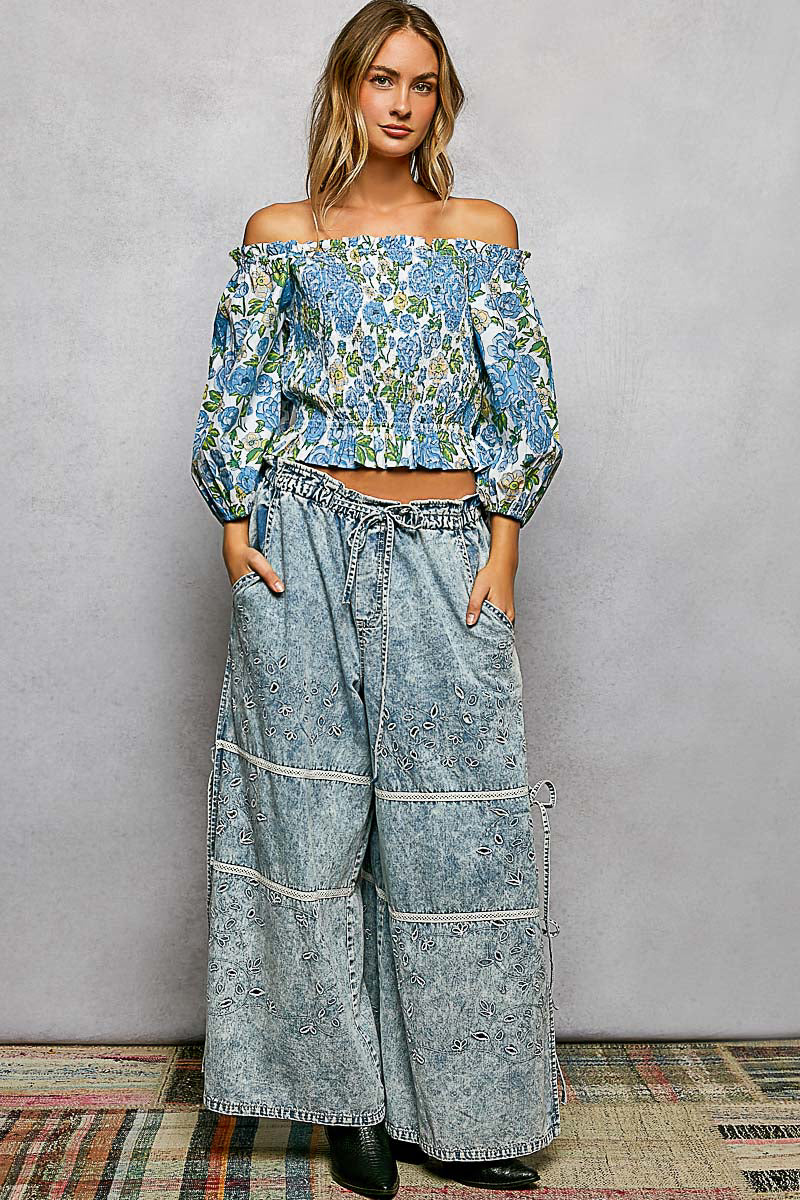 This printed woven top features an off-the-shoulder neckline and a fully smocked bodice for a secure, flattering fit. It has softly puffed 3/4 sleeves, a subtle ruffled hem, and a fresh floral motif with lightweight drape. This easy statement piece adds shape, texture, and color to warm-weather styling.