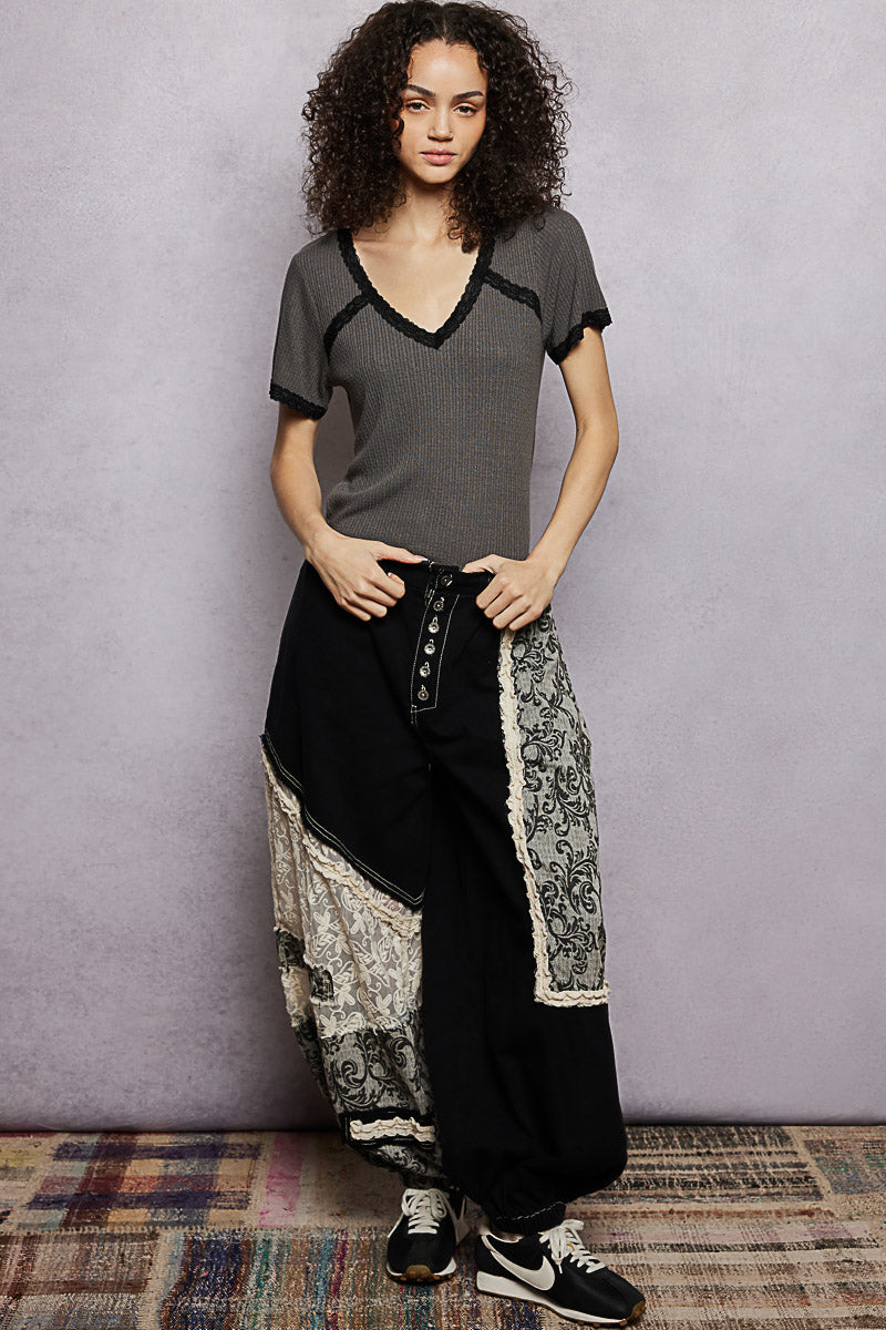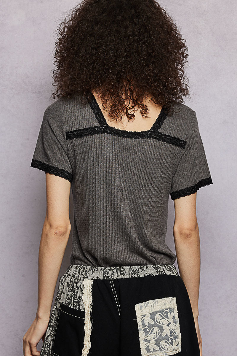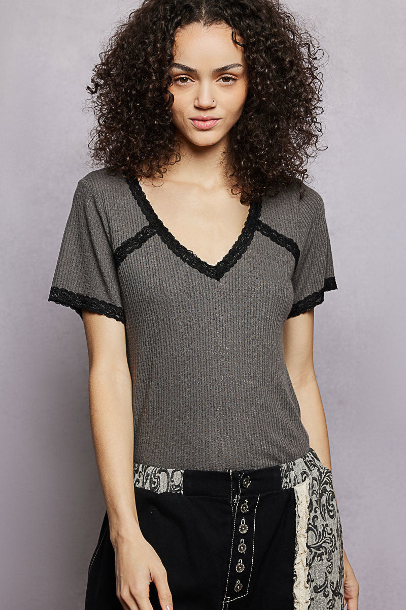 This V-neck short-sleeve basic top has a regular fit and is crafted from textured knit with delicate lace accents. Finished with vintage washing in a solid color, it offers a soft, feminine touch and is perfect for everyday wear or layering.