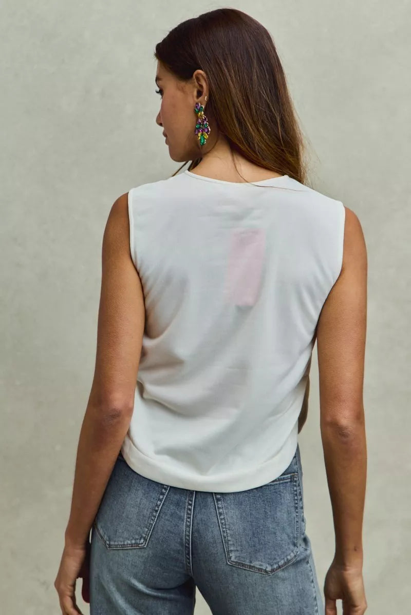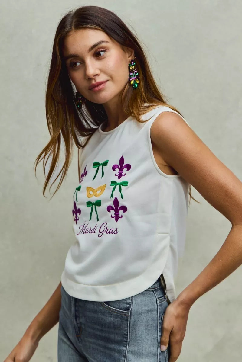 Celebrate Mardi Gras in style with the festive Mardi Gras Fleur De Lis and Ribbon Embroidered Top. This top features intricate embroidery of Fleur De Lis and ribbons, capturing the essence of the holiday spirit. The lightweight and comfortable fabric ensures a stylish and comfortable wear during Mardi Gras festivities. Stand out with the unique and eye-catching design of this embroidered top at your Mardi Gras celebrations. Embrace the festive vibes and add a touch of flair to your ensemble with this Mardi Gras-themed top.