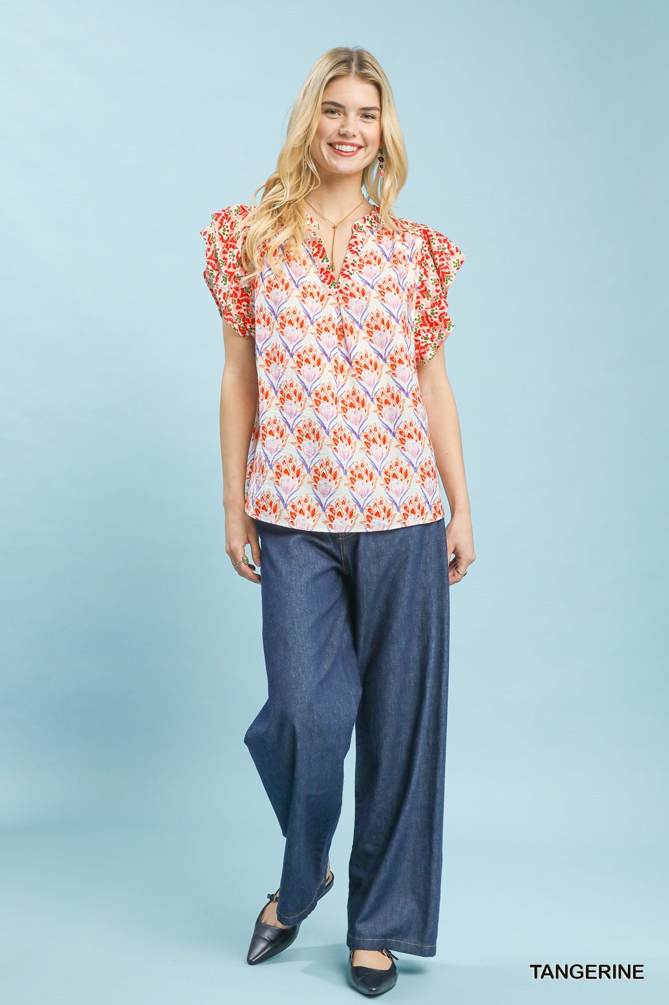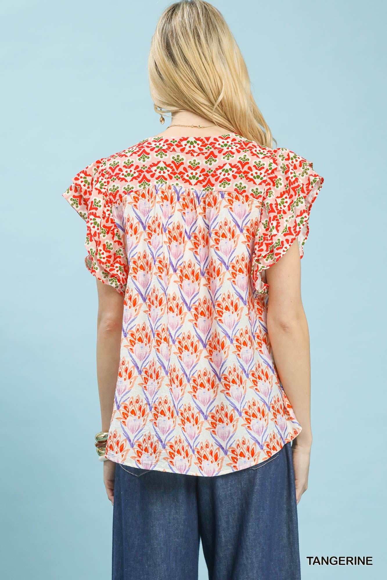 This floral print top features a hand-block inspired floral pattern, a flattering V-neckline, and charming double frill sleeves, while its boxy, relaxed fit and unlined design deliver an artistic, vacation-ready style that’s lightweight, comfortable, and effortlessly easy to wear for any casual occasion.