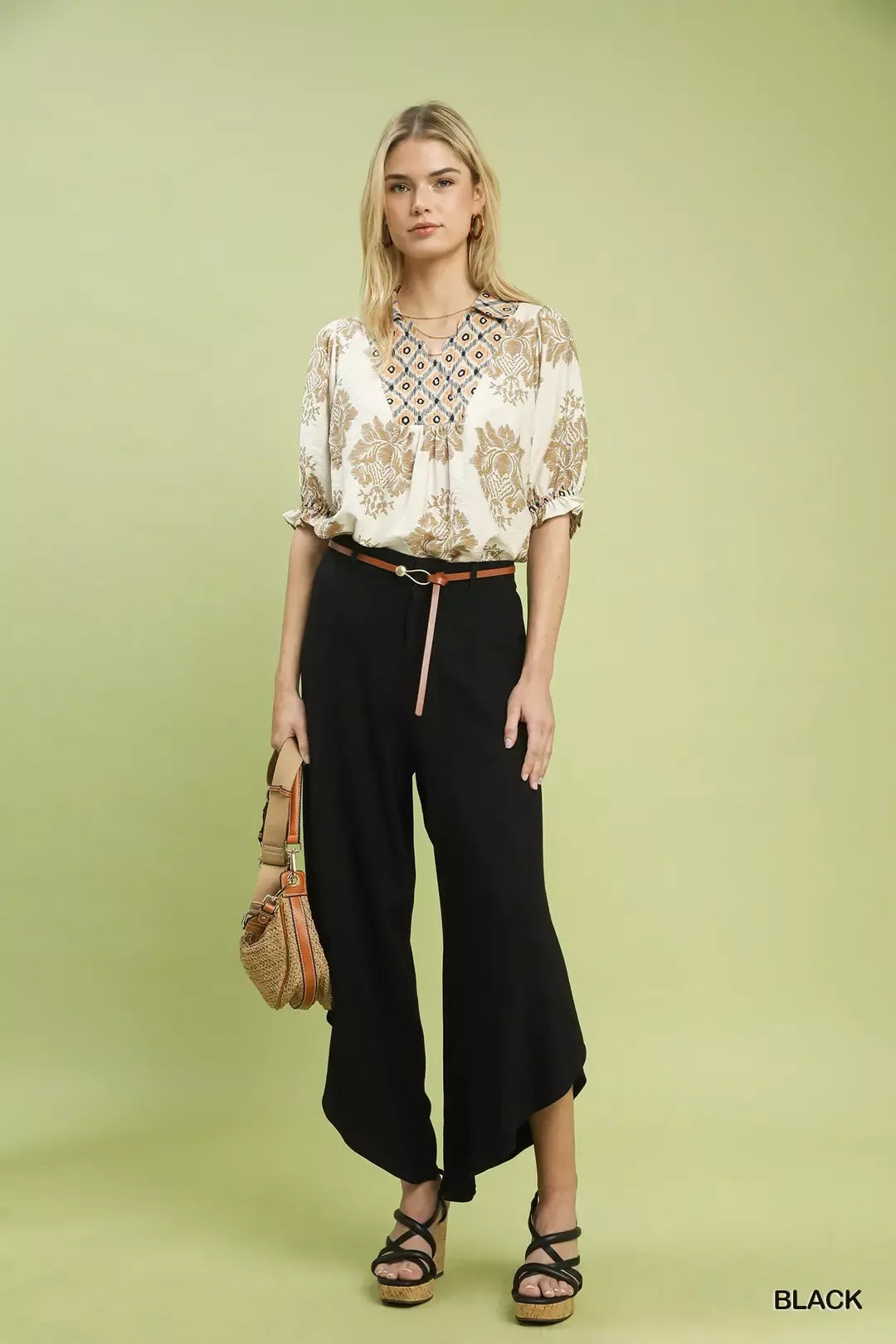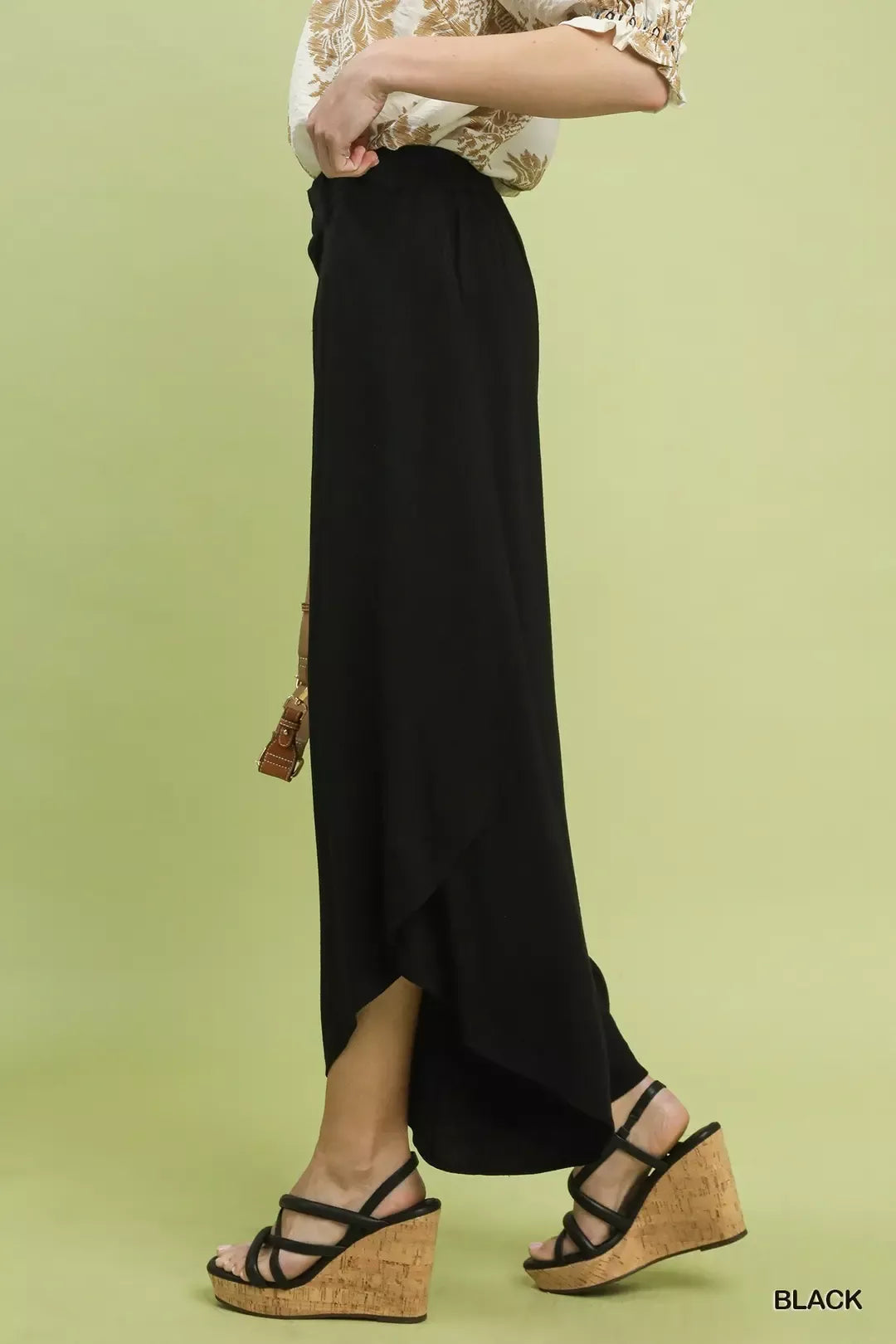 These Flowy Asymmetrical Hem Wide Leg Pants are a stylish and breezy addition to your wardrobe. The asymmetrical handkerchief hem adds a unique and playful touch to the classic wide leg silhouette. Made from linen, these pants are lightweight and perfect for warmer weather. Please note that these pants are not lined, providing a breathable and comfortable fit. Elevate your casual or dressy look with these flowy pants that offer a trendy twist with their asymmetrical hem design.