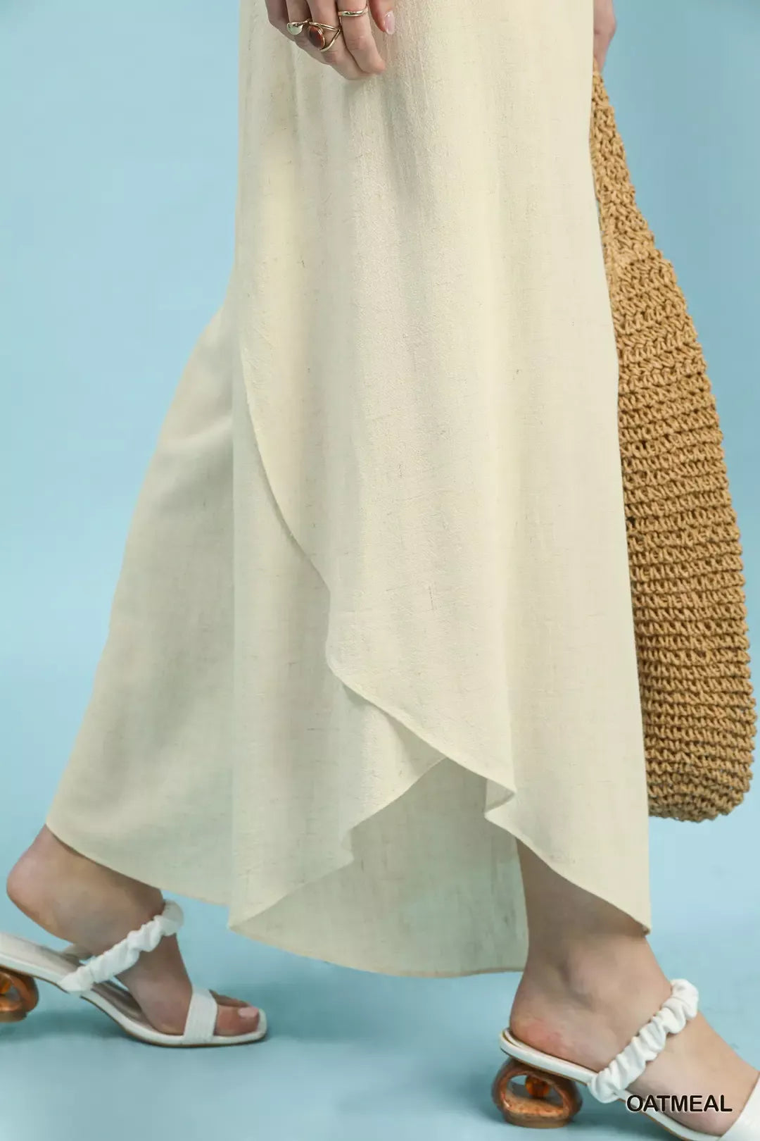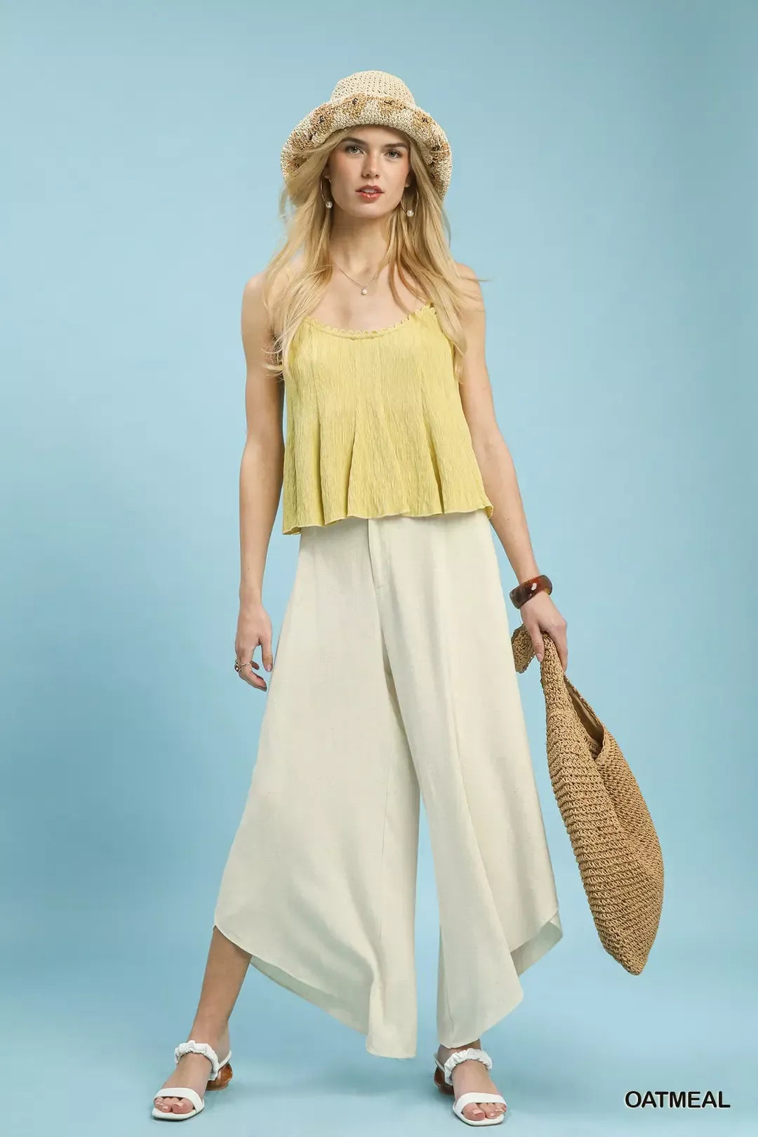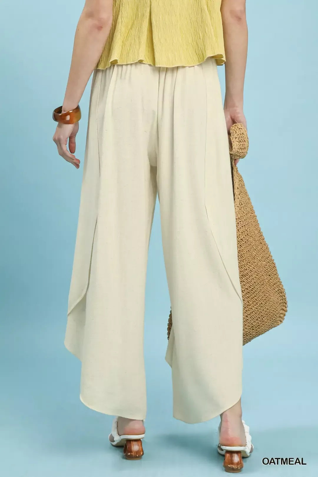 These Flowy Asymmetrical Hem Wide Leg Pants are a stylish and breezy addition to your wardrobe. The asymmetrical handkerchief hem adds a unique and playful touch to the classic wide leg silhouette. Made from linen, these pants are lightweight and perfect for warmer weather. Please note that these pants are not lined, providing a breathable and comfortable fit. Elevate your casual or dressy look with these flowy pants that offer a trendy twist with their asymmetrical hem design.