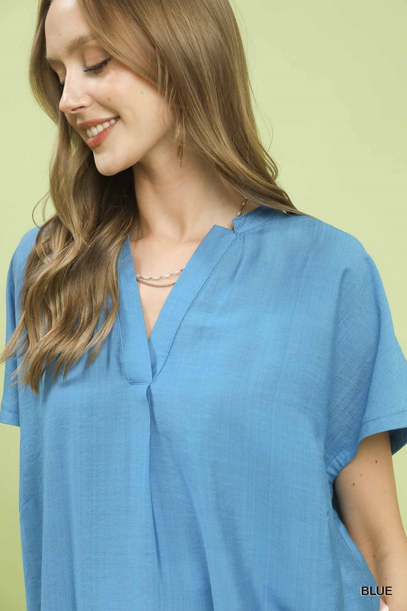 The flowy V-neck short sleeve blouse is a versatile and effortless piece for any wardrobe. With its relaxed fit and flowy silhouette, this blouse offers a comfortable and flattering look. The V-neckline adds a touch of elegance and elongates the neck for a slimming effect. Perfect for both casual and dressier occasions, this blouse can be dressed up with a skirt or trousers or styled casually with jeans. The short sleeves provide a breezy and comfortable feel, making it ideal for warmer days. Elevate your everyday style with the chic simplicity of this flowy V-neck short sleeve blouse.