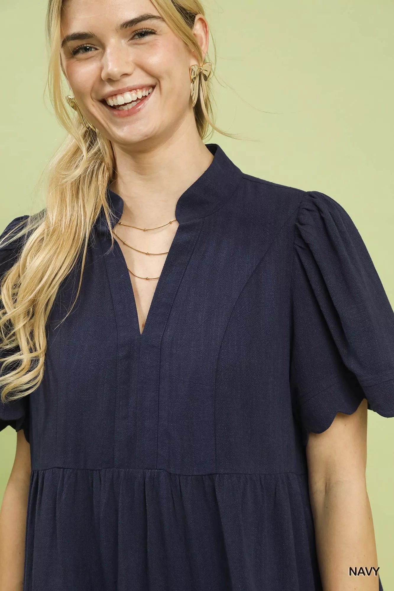 This linen tiered babydoll dress is a versatile and stylish choice, featuring a split V-neck and short scalloped sleeves for a feminine touch. The practical pockets add functionality to the design, while the lining enhances comfort and coverage. Perfect for a casual and effortless look, the dress combines comfort with chic style. The tiered silhouette adds dimension and movement to the outfit, making it a flattering and easy-to-wear option for various occasions. Ideal for a relaxed and fashionable ensemble that exudes charm and comfort.