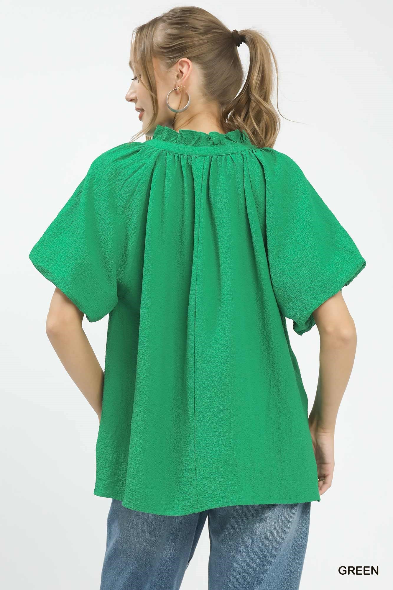 This ruffle neck tunic top blends feminine charm with modern comfort. It features a V-neckline with delicate ruffle trim and a button placket, paired with wide flutter sleeves. The oversized, boxy fit and textured fabric offer a relaxed yet bold look, while the lined sleeves add softness.