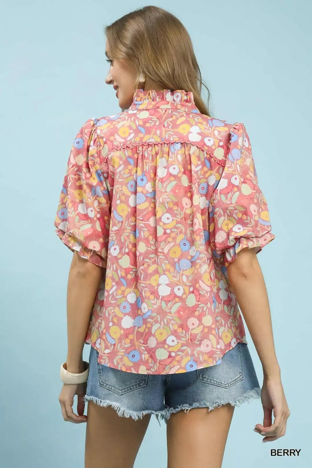 The Smocked Floral Ruffle Trim Top is a charming and feminine piece that will elevate your wardrobe. Featuring short puff sleeves with a ruffled hem, this top exudes a whimsical and romantic vibe. The split V design with smocked and ruffled collar adds an elegant and sophisticated touch to the top. The allover floral print offers a fresh and stylish look, perfect for the season. Additionally, the sleeves are lined for added comfort and quality. Embrace a chic and trendy style with this beautifully detailed top that is sure to make a statement wherever you go.