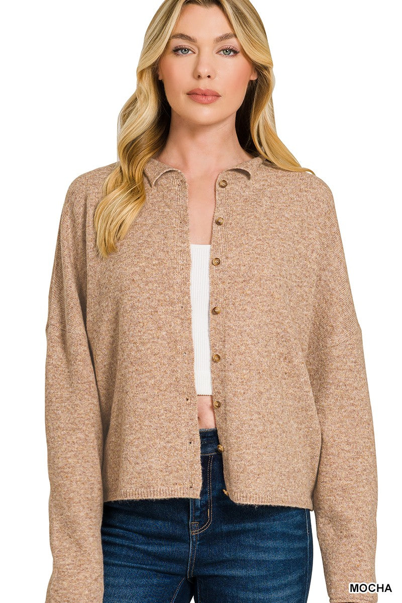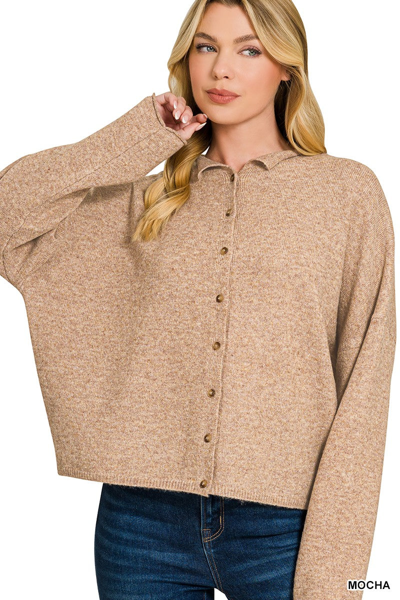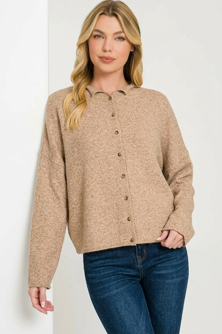 This relaxed fit cardigan is crafted from a soft knit fabric, offering both comfort and style. The button-down closure and collared neckline add a touch of sophistication, making it perfect for layering. Its versatile design allows for easy pairing with various outfits, ideal for creating a casual yet chic look. The long sleeves provide added warmth, making it a great choice for cooler days.