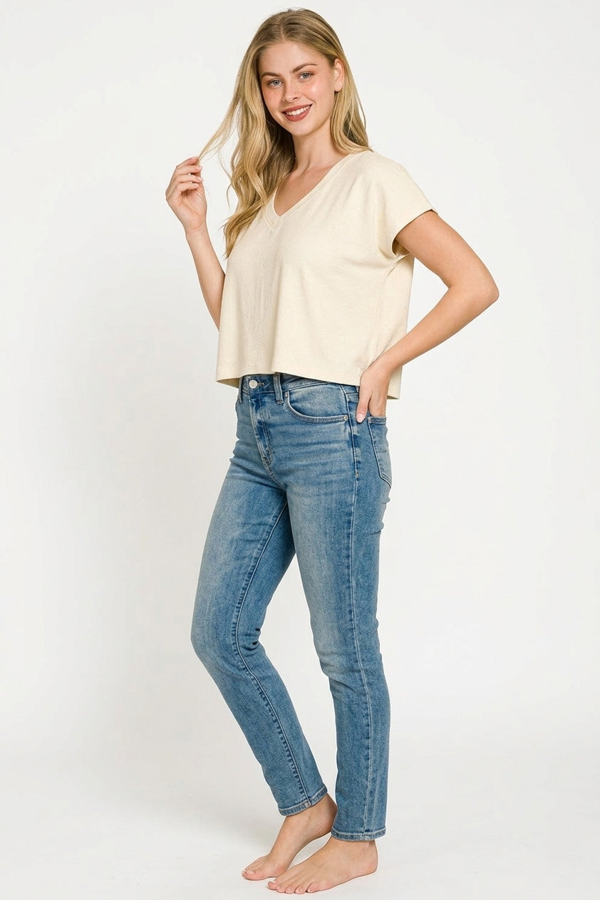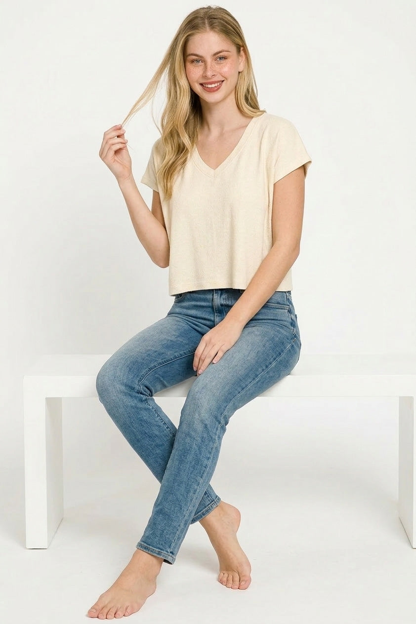 Zenana Soft Melange V-neck Drop Shoulder Cropped Top