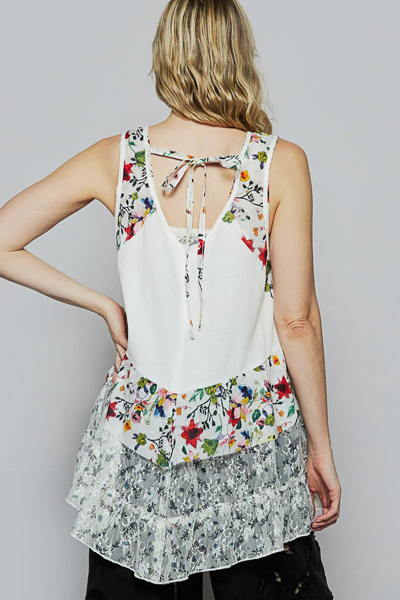 This stunning floral print cami tank features a flattering V-neckline and sleeveless design perfect for warm weather styling. Crafted from lightweight, breathable fabric with a vibrant multicolor floral pattern against a white base. The piece showcases delicate lace trim accents and a charming layered ruffled hem that adds feminine movement and visual interest. The relaxed fit and comfortable construction make it ideal for casual everyday wear, while the romantic floral design and lace details elevate the look for versatile styling options. Perfect for plus size figures seeking comfortable yet stylish wardrobe essentials.