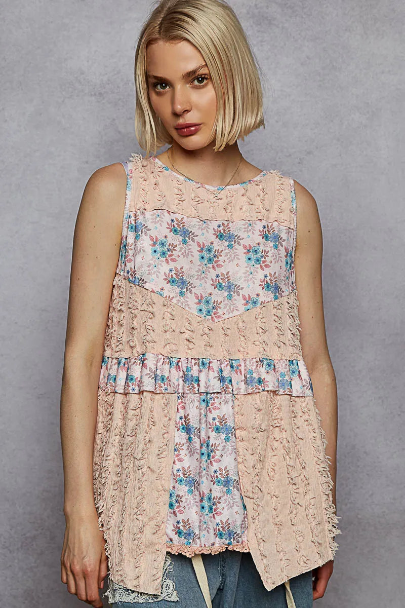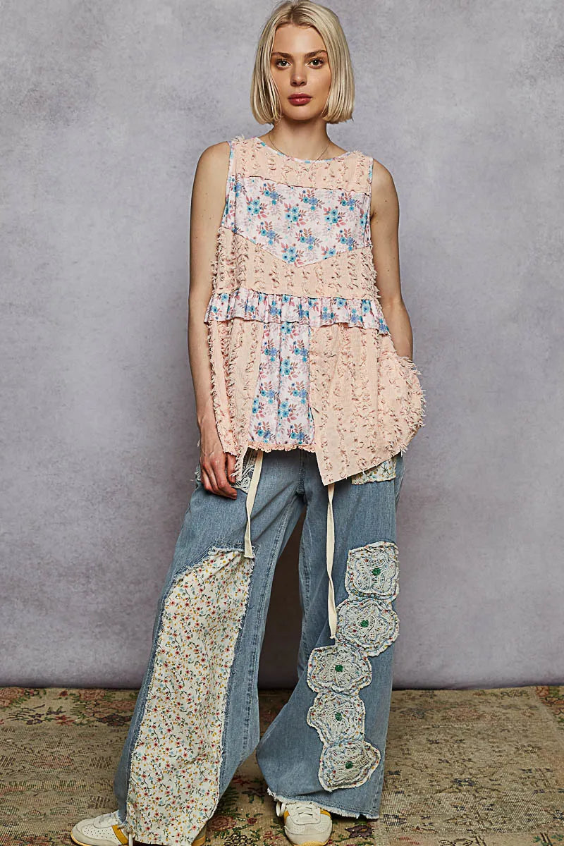 This enchanting bohemian-style sleeveless blouse features exquisite floral embroidery in soft blue tones against a delicate beige base. Crafted with premium lightweight fabric and adorned with intricate lace overlay, this peplum-cut top offers both comfort and elegance. The romantic floral motifs combined with subtle beadwork create a vintage-inspired aesthetic perfect for modern fashionistas. The relaxed fit and breathable material make it ideal for warm weather styling, while the sophisticated embellishments ensure it transitions beautifully from day to evening wear. The feminine peplum silhouette flatters all body types and adds a touch of whimsical charm to any wardrobe.