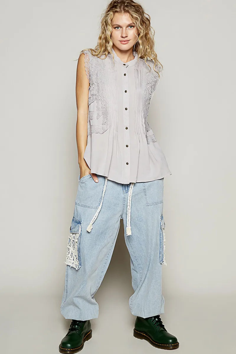 This stunning bohemian-inspired sleeveless blouse features exquisite Lace detailing that adds artisanal charm to any outfit. Crafted from comfortable cotton blend fabric with textured elements, this button-front top offers a relaxed fit that flatters all body types. The neutral gray tone makes it incredibly versatile for mixing and matching with various bottoms. Key selling points include the intricate embroidery work, breathable sleeveless design perfect for warm weather, and the classic button closure that allows for styling versatility. The casual yet refined aesthetic makes it suitable for both everyday wear and special occasions, while the quality construction ensures long-lasting durability and easy maintenance.