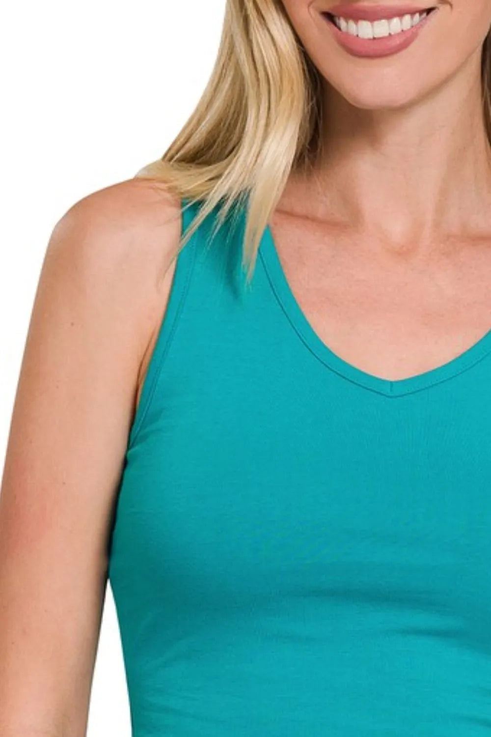This stunning turquoise cropped tank top features a flattering V-neckline and sleeveless design perfect for warm weather styling. Made from soft, stretchy cotton blend fabric that provides comfort and flexibility throughout the day. The fitted silhouette hugs your curves beautifully while the cropped length creates a modern, fashion look. The vibrant turquoise color adds a pop of brightness to any outfit. Ideal for casual outings, beach days, or layering under jackets and cardigans. Machine washable for easy care and built to maintain its shape and color after multiple washes.