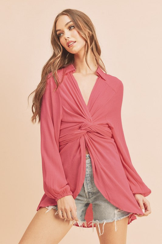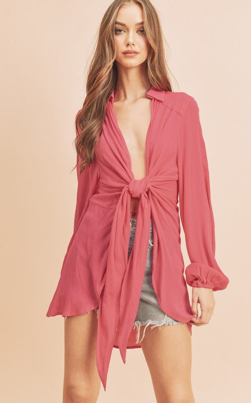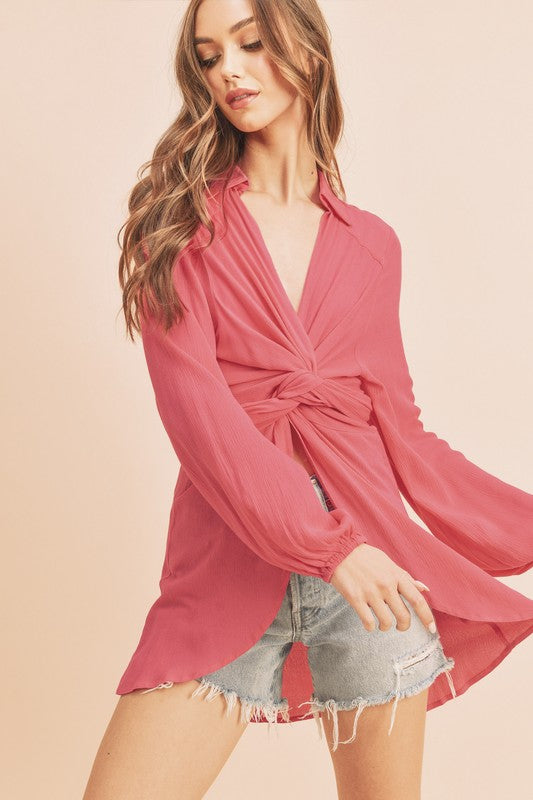 Aemi + Co Tied Collared Neck Long Sleeve Top