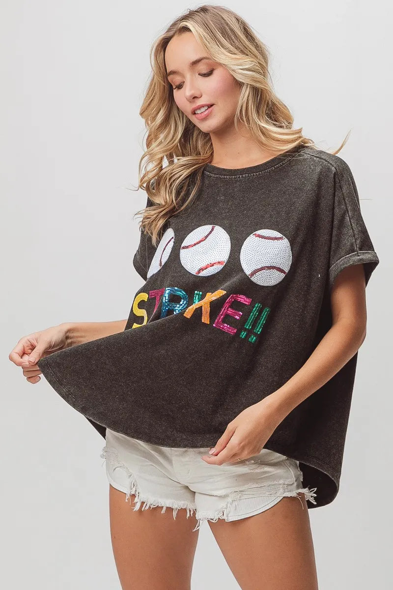 The Sequin Baseballs Strike Washed Short Sleeve Top combines sporty style with a touch of glamour. This top features sequin baseball motifs on a washed fabric for a trendy look. Perfect for adding a fun and playful element to your casual outfits.
