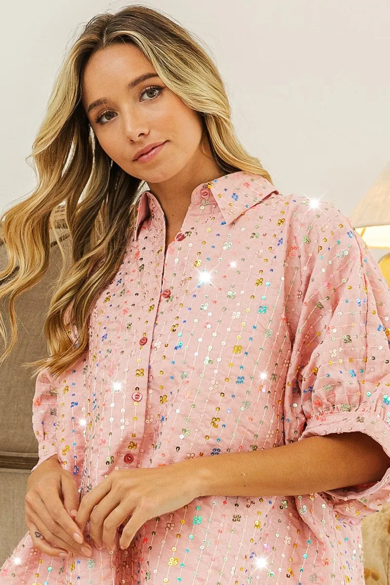 The Sequin Striped Short Dolman Sleeve Blouse is a glamorous and trendy piece featuring sequined stripes and short dolman sleeves. The sequin detailing adds a touch of sparkle and glamour to the blouse, making it perfect for a night out or special occasions. The dolman sleeves offer a relaxed and comfortable fit, while the striped design adds a modern and chic element to the overall look. Pair this blouse with pants or a skirt for a stylish and eye-catching ensemble that is sure to turn heads.