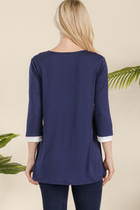 This style comes in a classic tri-color combination. The V-neckline has layered tri-color detail, that gives it a preppy look. The lightweight material makes this top a year round piece. The solid with the pop of bright color makes this top a statement.