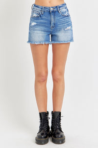 The High Rise Distressed Raw Hem Denim Shorts offer a trendy, contemporary look with a high-waist design and raw hem detailing. The high rise accentuates your waist and creates a flattering silhouette, while the distressed elements add a touch of rugged charm. The raw hem provides a modern, unfinished look, enhancing the shorts' casual, laid-back vibe. Crafted from durable denim, these shorts are both stylish and comfortable, making them a versatile choice for summer adventures or relaxed outings.