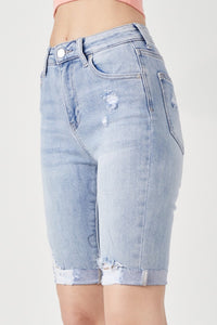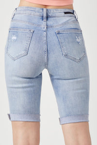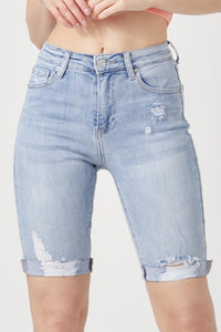 The High Rise Distressed Denim Bermuda Shorts offer a trendy twist on classic denim. With their high-rise fit, these shorts provide a flattering silhouette while the distressed detailing adds a touch of casual edge. The Bermuda length ensures comfort and versatility, making them a stylish choice for laid-back summer days or a relaxed weekend look.